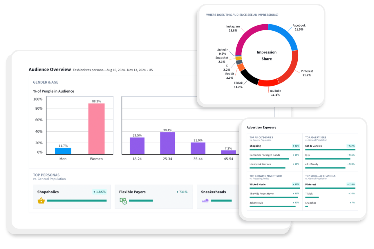 See ads served, spend and impression estimates, SOV, and more across key channels, like: Facebook, Instagram, TikTok, X (formerly Twitter), Reddit, OTT, YouTube, display, video, and others.