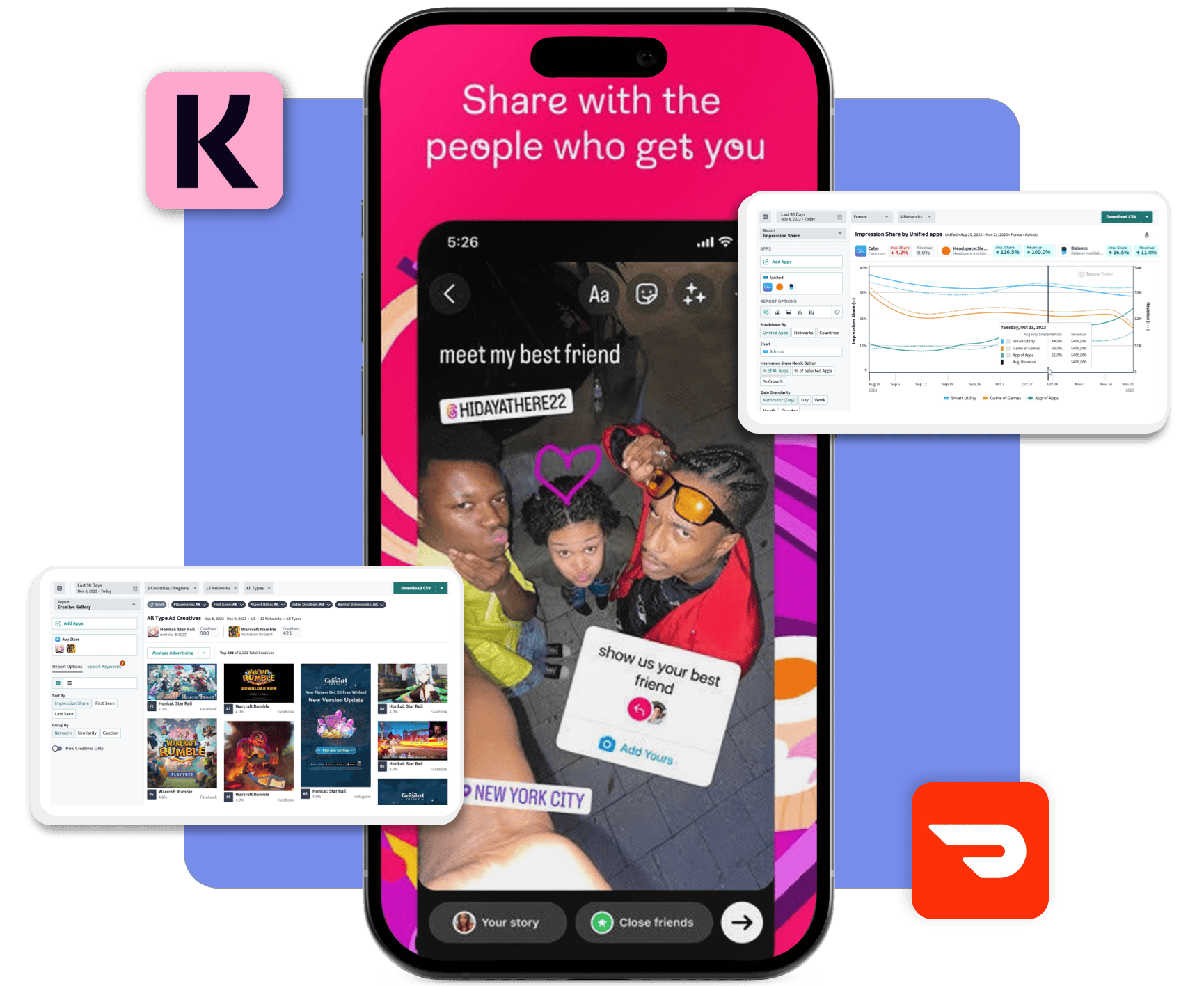 Track shifts in ad activity through Share of Voice, impression trends, and side-by-side comparisons with downloads and revenue to reveal real ad impact and capture the white space.