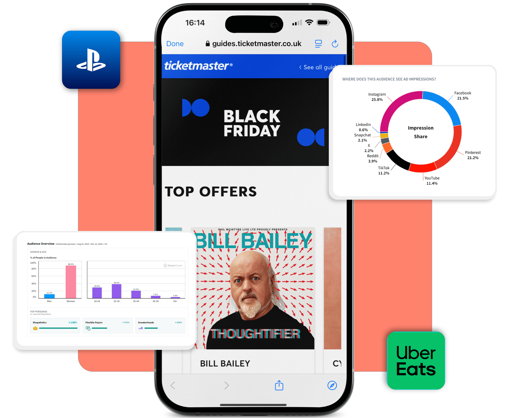 Discover the demographics of your existing app users and the ads they viewed, personas that make up your user base, the advertisers targeting them on social media, and the other apps they’re using.