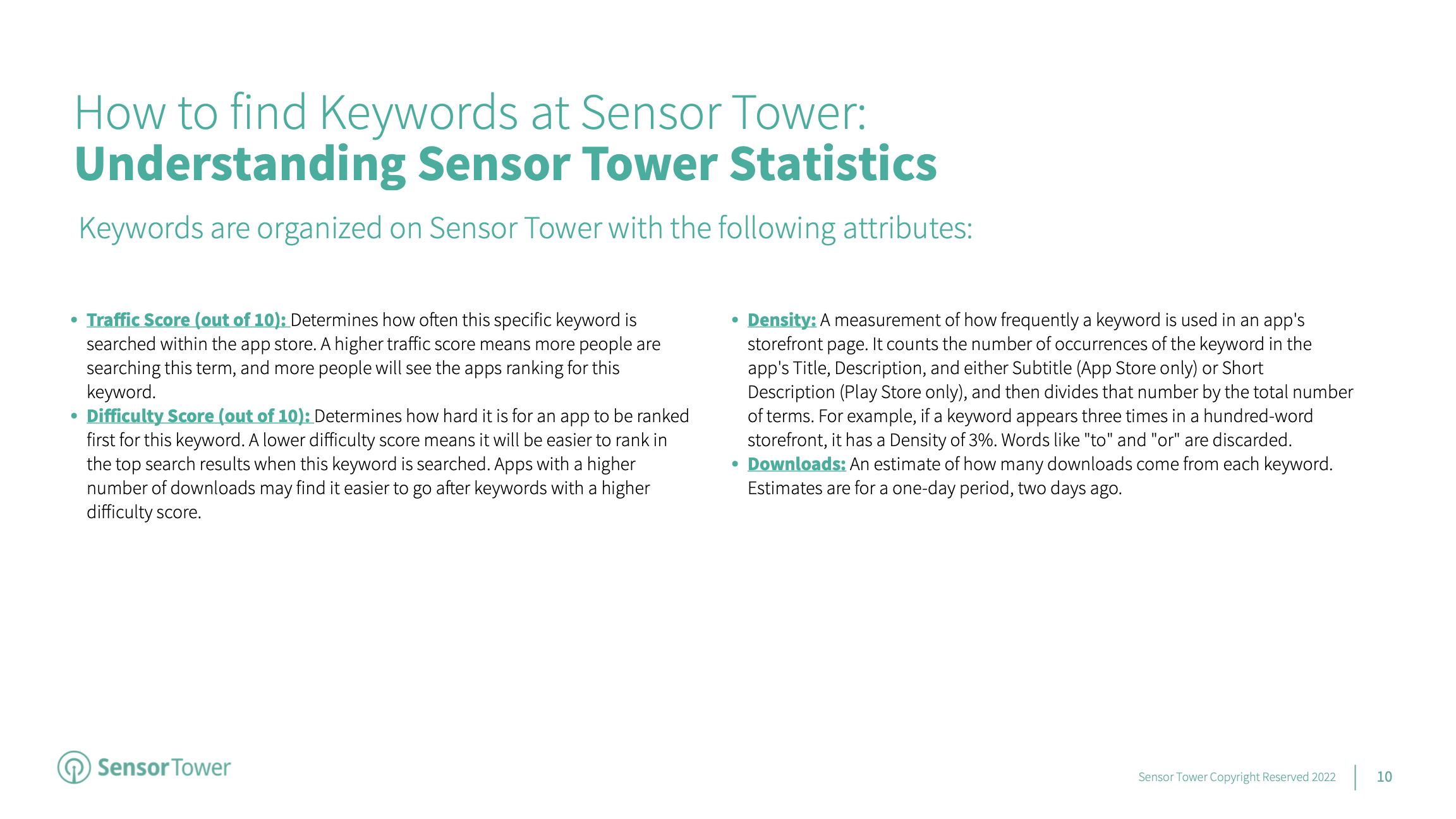 Sensor Tower’s ASO Playbook also explains the different attributes found on the platform’s modules: