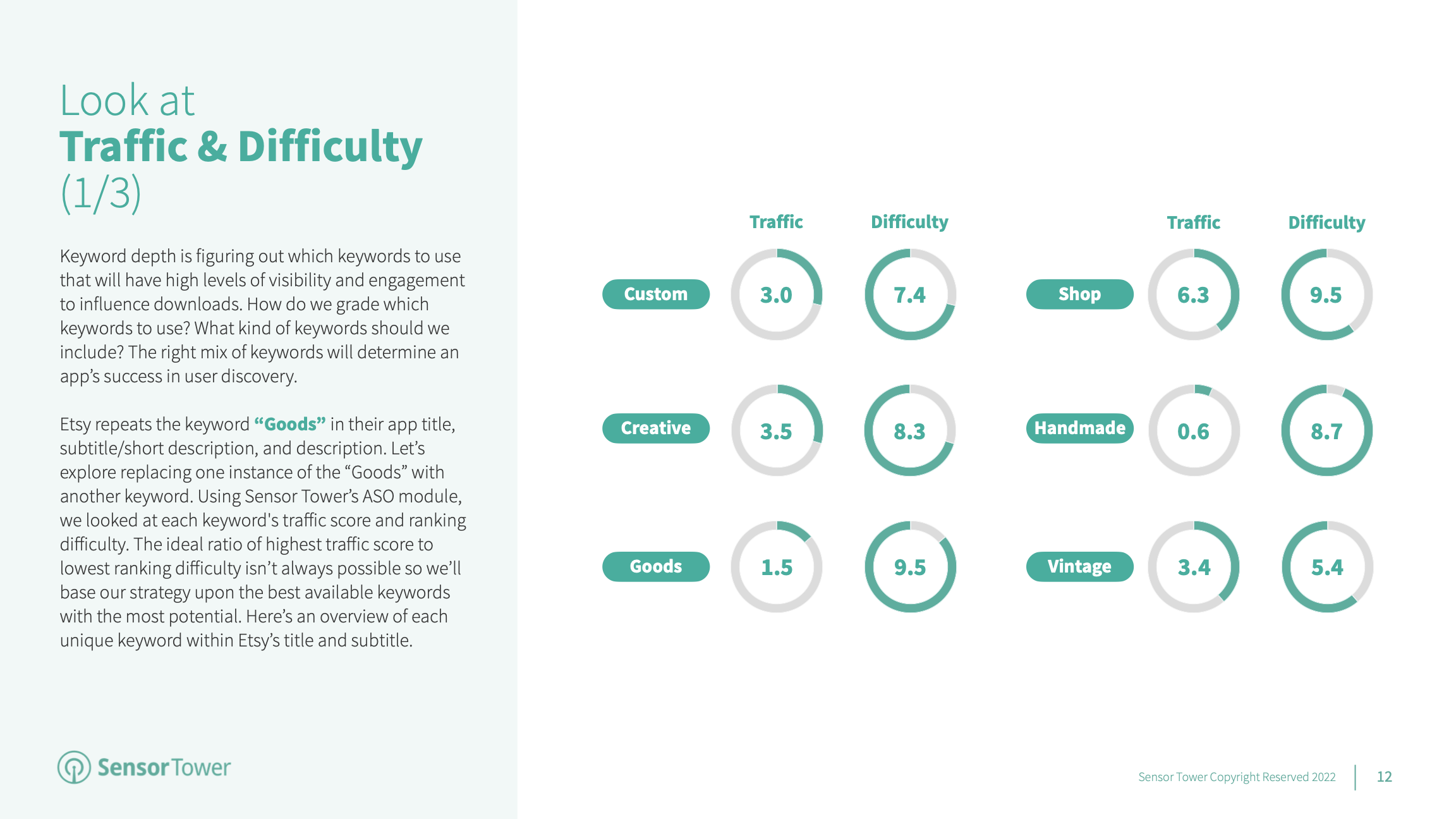 When you look at Traffic & Difficulty attributes on Sensor Tower, you will notice the ideal combination of highest traffic score and lowest ranking difficulty isn’t always possible. But with the suggested keywords provided by our platform, you can easily select the keywords with the highest potential. Another aspect that you also have to consider when choosing a keyword is how relevant a keyword is to your app. More details can be found in our ASO Playbook using the Etsy as an example.