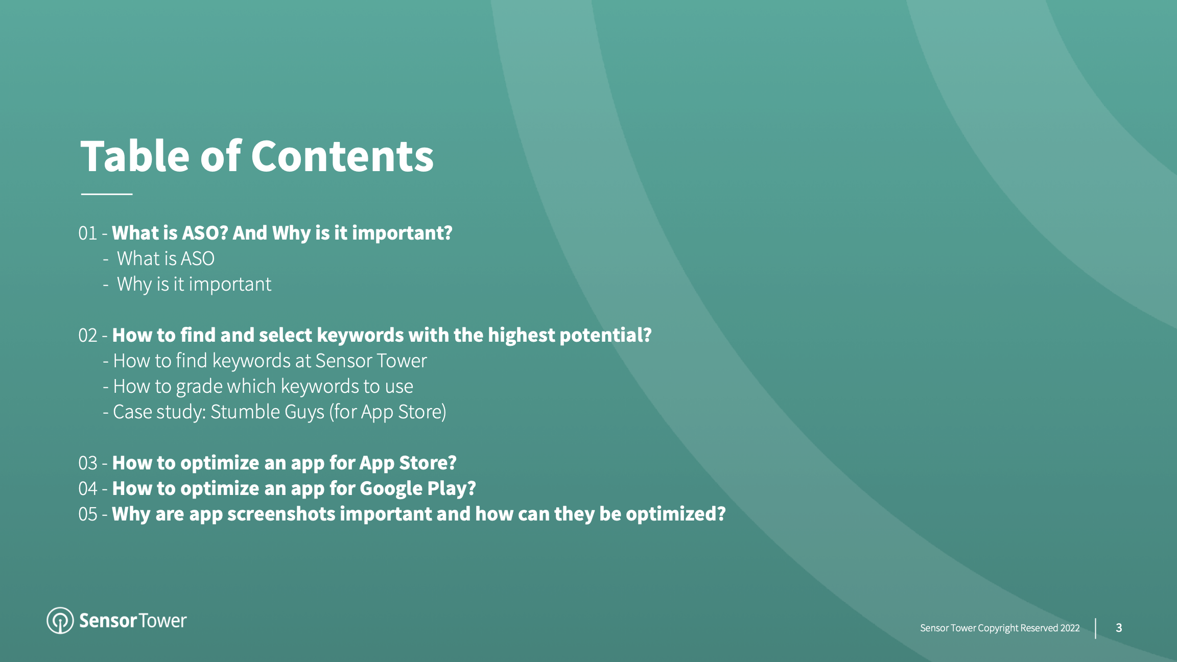 Even if you are in the very early stages of exploring ASO, this ASO Playbook will gear you up quickly. It consists of the following five sections:
