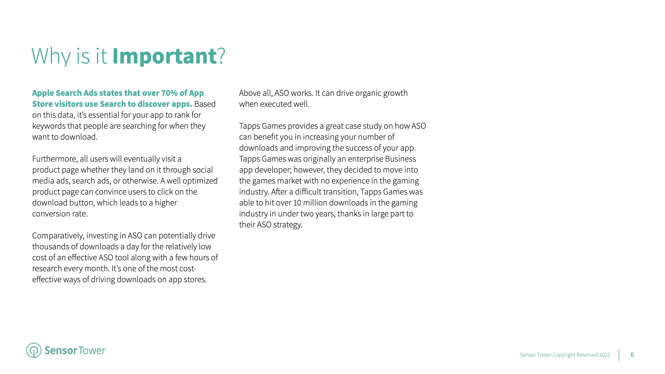 Above all things, ASO works. ASO can drive organic growth when executed well. With ASO, Tapps Games was able to hit over 10 million downloads in the gaming industry within two years. That case study, available in the ASO Playbook, is a great illustration of how ASO can help you get more downloads for your app and boost its success.