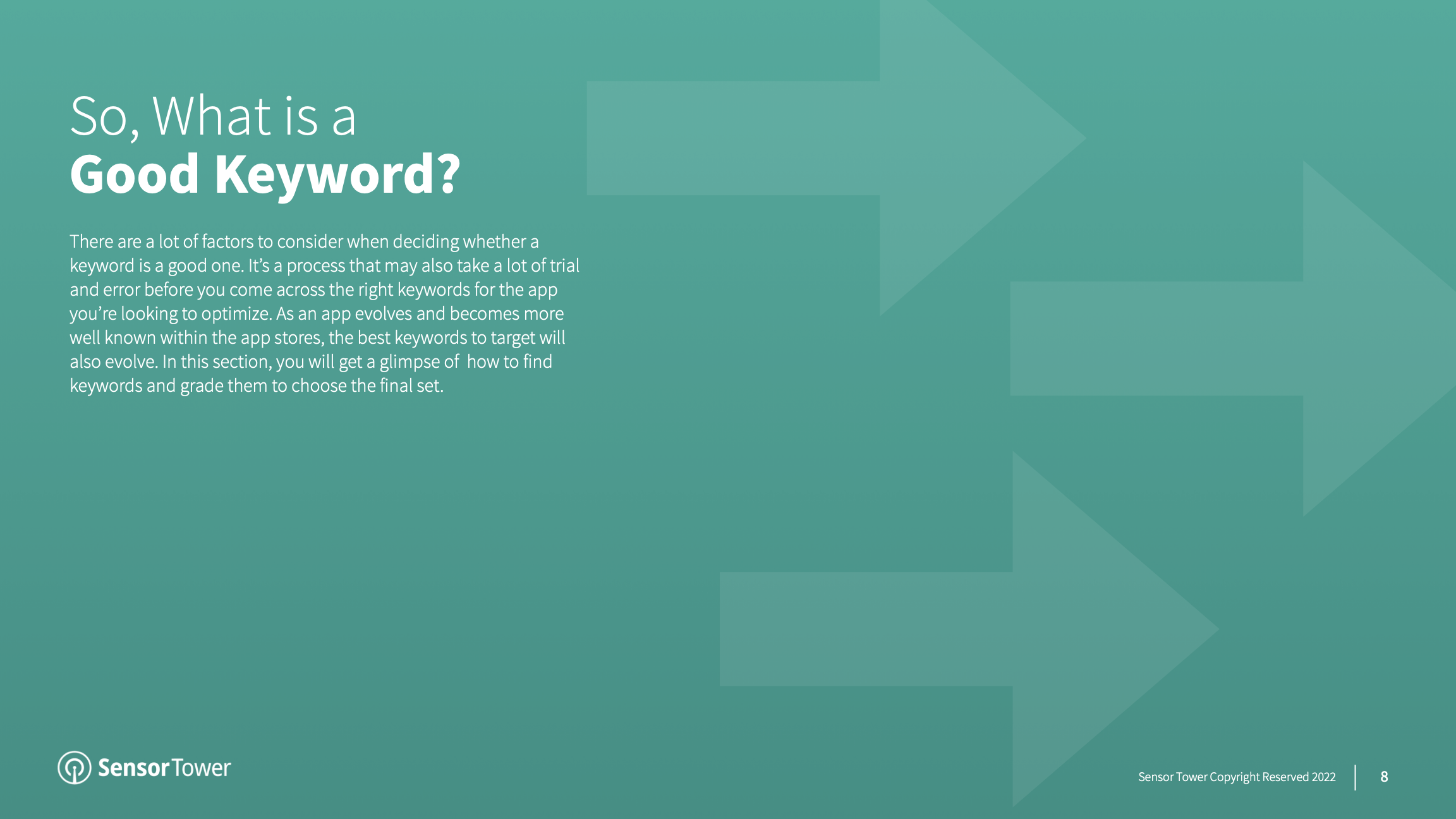 There are a lot of factors to take into account when you evaluate whether a keyword is a good one. The process also takes a lot of experimentation before you come across the right keywords for the app you’re looking to optimize. In the ASO Playbook, you will learn how to find keywords and prioritize them by using Sensor Tower’s ASO tools.