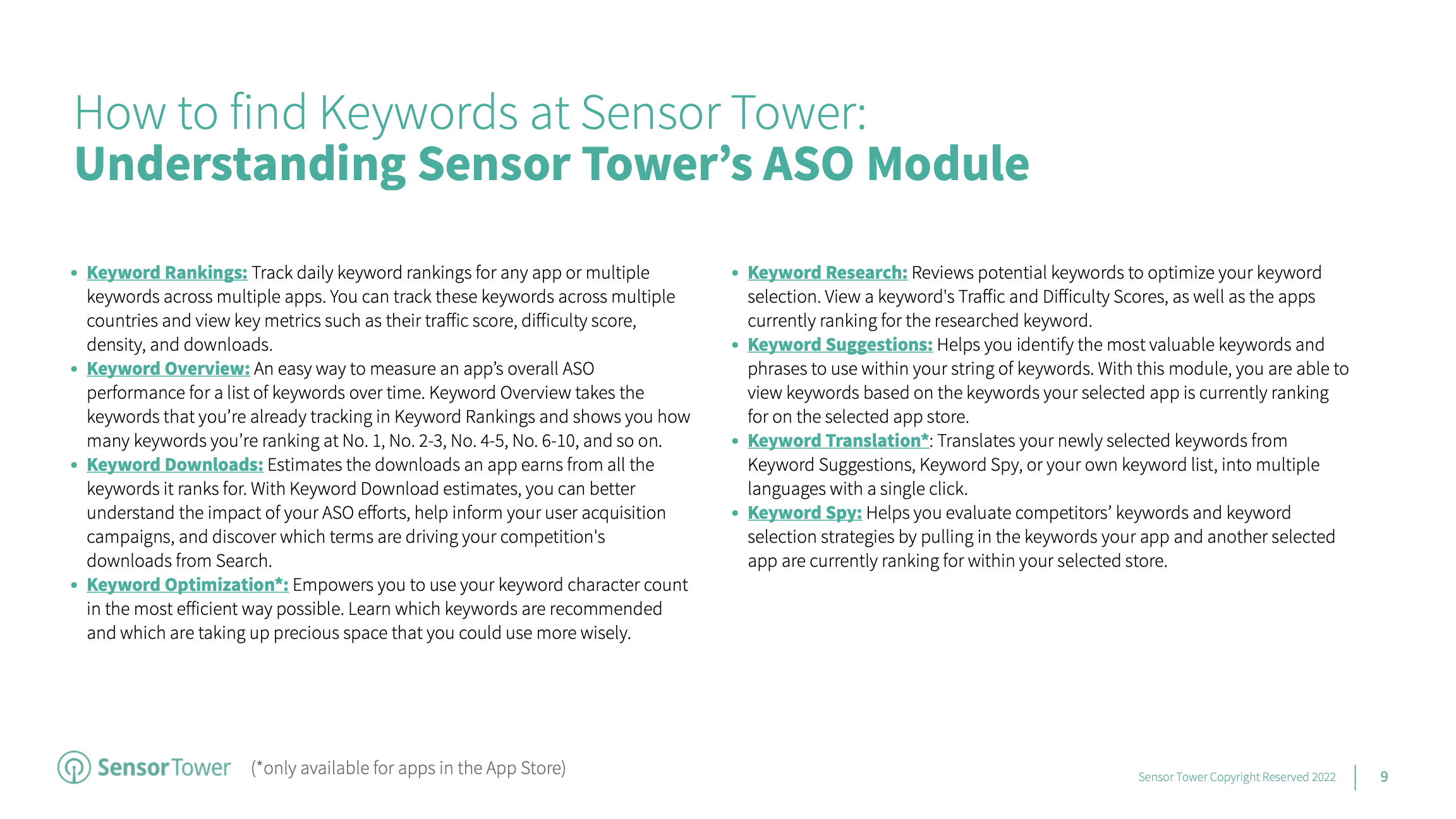 The ASO Playbook provides a quick overview of Sensor Tower’s modules, which can help you detect high-quality keywords in your competitive landscape. These tools include: