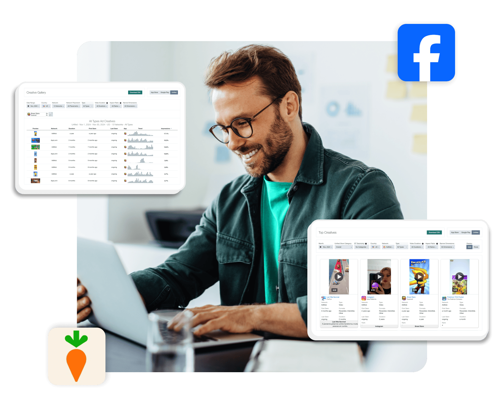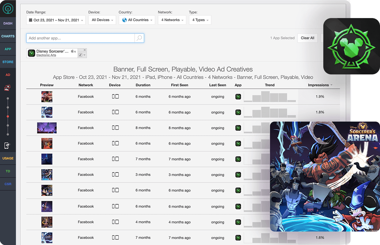 Sensor Tower layers multiple datasets to offer a holistic look into the paid mobile landscape. Access an expansive library of in-app mobile creatives and insights across some of the most popular ad networks, including social networks like Facebook, TikTok and more. Zero in on the creatives gaining the most traction by Share of Voice, including playable ads, and apply learnings to quickly iterate and amplify paid ad campaigns.